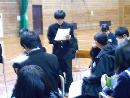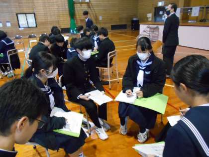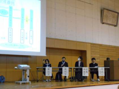 5、6時間目に模擬裁判が行われました。実際に富山家庭裁判所の方に来ていただいて模擬裁判をしました。その後、グループに分かれて処遇について話し合いました。どのグループも熱く議論していました。