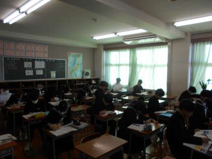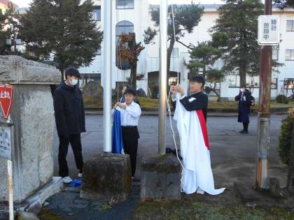 上:国旗・校旗の掲揚です。 教室の様子です。 中:1A 下:2A