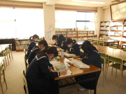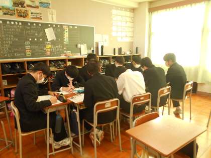 社会の様子です。自由進度学習を行っています。グループになり各々のペースで「労働者の権利」についてまとめています。