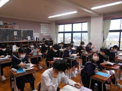 朝の様子3 公開日 2023/12/07 更新日 2023/12/07 学校生活 教室の様子です。 3年生は、テスト勉強をやっていました。 人権作文は、終礼で読んで、感想を書きます。 上:3A 下:3B