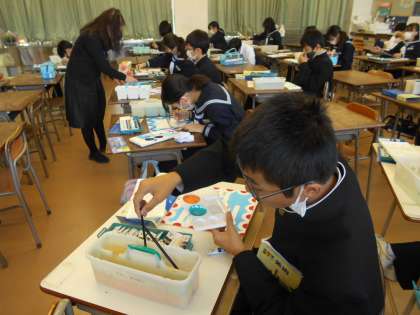 美術では「伝統文様」の製作をしています。色塗りもいよいよ大詰めを迎え、とても集中しています。