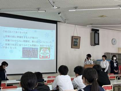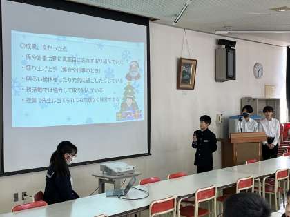 12月21日 2学期末学年集会 公開日 2023/12/22 更新日 2023/12/22 1年生 学年生徒会の皆さんが学年集会を企画、運営してくれました。 2学期のふり返りをスライドにまとめ、上手に仲間たちに伝えることができました。 2024年はついに先輩になります。立派な先輩になる準備をする3学期にしたいですね。 先生たちは、来年も全力で皆さんのことを応援します。 一緒に頑張りましょう。 それでは、充実した冬休みを。