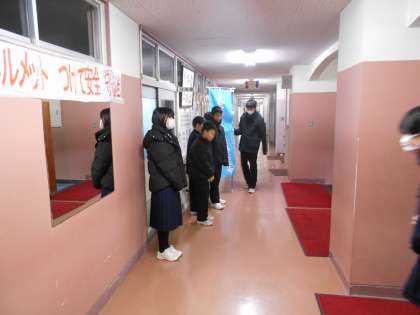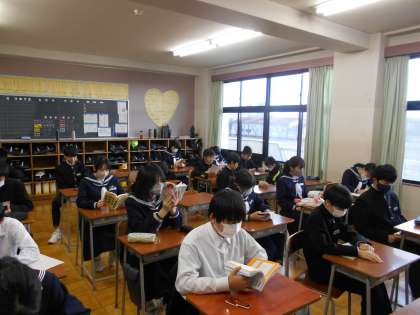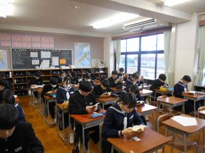 上:さわやかあいさつ運動の様子です。 教室の様子です。 中:1A 下:2A