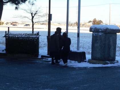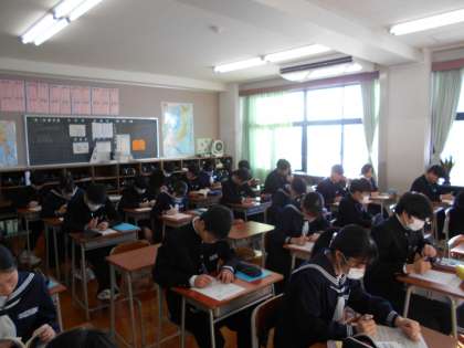 上:国旗・校旗の掲揚の様子です。 教室の様子です。 中:1A 下:2A