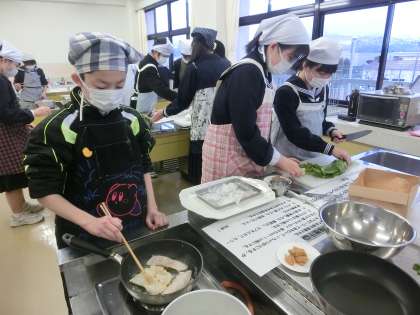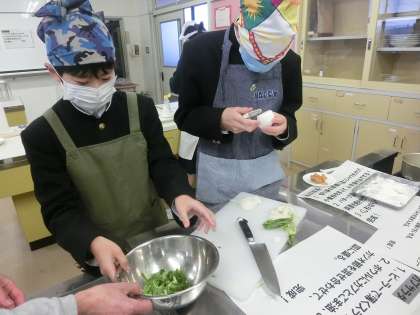 家庭 調理実習でたらのムニエル、かぶサラダ、かぶと油揚げの味噌汁を作りました。