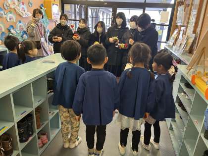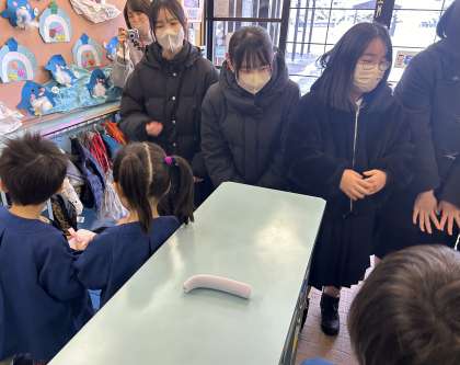 家庭科の時間に作ったおもちゃを上条保育所へ持っていきました。