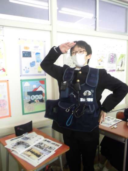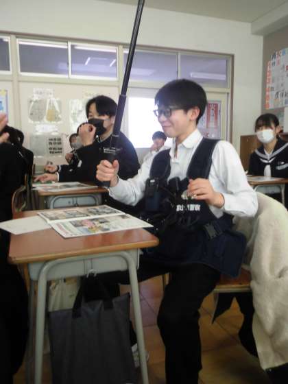 警察の職務の話を聞き、防刃チョッキや警棒に触れさせていただきました。どの生徒も興味津々の様子でした。