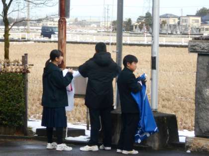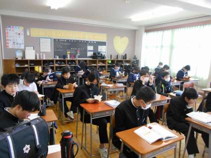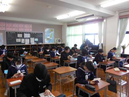 上:国旗・校旗の掲揚の様子です。 中:1A教室の様子です。 下:2A教室の様子です。