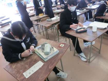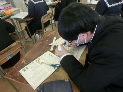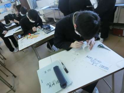 美術 サンドブラストでガラスのコップにデザインを描いています。
