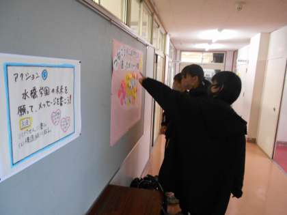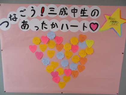 SNJs×人権プロジェクト3 公開日 2024/02/25 更新日 2024/02/25 学校生活 上:全てのお題を終え、保健室前に設置されたポストにカードを入れてい ます。 中:「水橋学園」の未来を願ってメッセージを書きました。 下:ハート型にメッセージが貼られました。 「思いやり溢れる学校になりますように!!」 「みんなが自分らしく過ごせる学校になったらいい」 「みんなが毎日、笑顔で過ごせますように」等、多くのメッセージ が寄せられました。