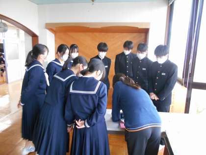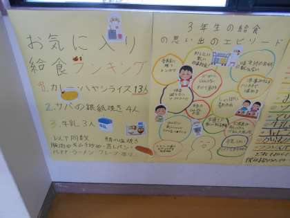 上:3年生が、なにやら作戦会議? 下:3年生の給食アンケート結果が掲示されていました。 お気に入り給食の第1は・・・
