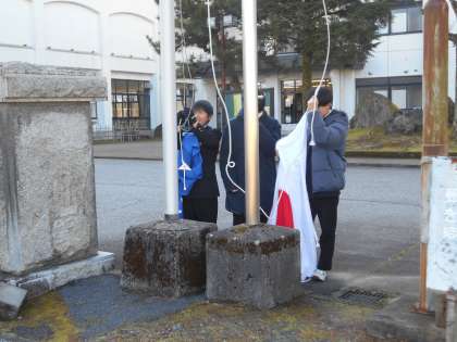 上:国旗・校旗の掲揚の様子です。 中:1Aの教室の様子です。 下:2Aの教室の様子です。