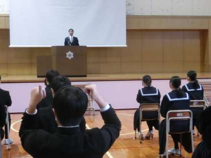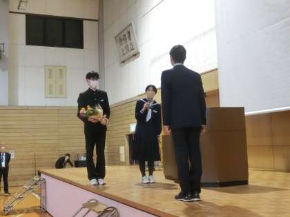 土肥先生 お別れ会 公開日 2024/03/13 更新日 2024/03/13 学校生活 土肥先生のお別れ会が行われました。3年生の代表から貨車の言葉と花束を送り、全校で『しあわせなら手をたたこう』を歌い、生徒たちにお別れのあいさつをいただきました。
