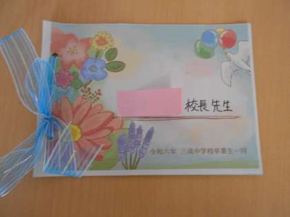 卒業式前日の今日、3年生の代表生徒が職員室で教職員に感謝の言葉を伝え、メッセージカードを手渡しました。