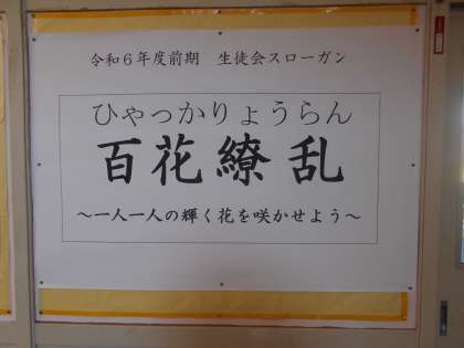 前期生徒会スローガン 公開日 2024/05/03 更新日 2024/05/03 生徒会・専門委員会 「百花繚乱」には、生徒一人一人が様々自分自身自分自身の個性やよいところを発揮しながら活躍してほしいという思いが。そして、サブタイトルには、三成中生自慢のあいさつや元気、笑顔を大切にし、互いを思いやれるような学校をつくっていきたいという思いが込められています。