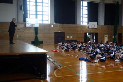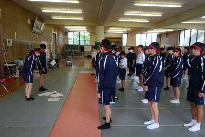 体育大会結団式 公開日 2024/05/08 更新日 2024/05/08 学校行事 5月30日(木)の体育大会に向けて、結団式を行いました。 朱雀団・青龍団のリーダーが元気よく意気込みを述べ、校長先生から団旗を受け取りました。 結団式の後は団別集会を行い、応援の練習に向けて士気を高めました。