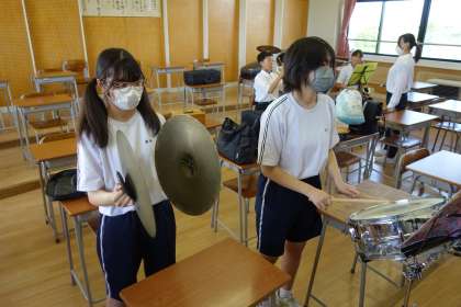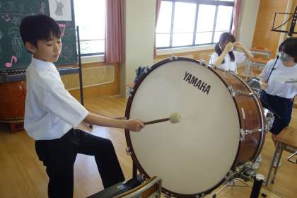 管楽器は、先生に音程を確認してもらいながら練習を進めています。 打楽器は、基礎的な練習をしています。