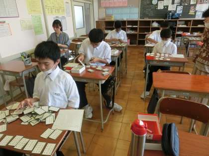 1A 学習の様子 公開日 2024/06/14 更新日 2024/06/14 学校生活 今日は市総合選手権のため、運動部以外の生徒は学校で自学をしています。 1年生は学習の合間に、百人一首の仕分けをしました。枚数の数えた方に個性が出ていました。