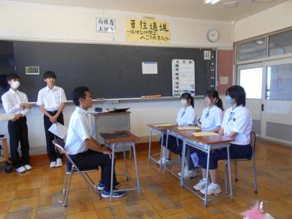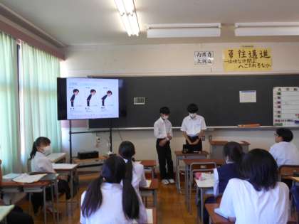 実行委員の生徒が、よくない振る舞いとよい振る舞いを演じ、望ましい訪問の仕方を学級全体で考えました。限られた時間の中での準備でしたが、大変素晴らしい演技でした。また、先日のマナー学習で学んだことも取り上げながら、「あいさつ・礼の仕方」「話し方」「聞き方」について全体で確認しました。