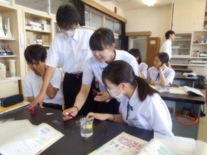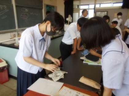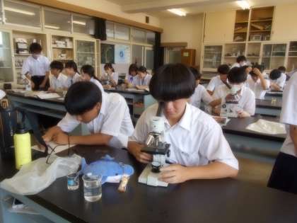 理科 体細胞分裂の観察をしました。顕微鏡を使って、核や染色体を確認しました。
