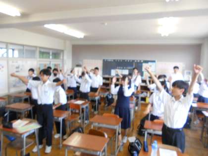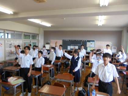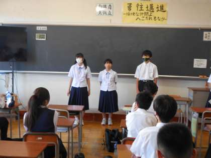 「14歳の挑戦」結団式 その5 公開日 2024/07/08 更新日 2024/07/08 2年生 (写真左)梅かま 一人ずつ意気込みを述べた後、全員で気合いの掛け声を出しました。やる気に満ちあふれている様子です。(写真中、右)