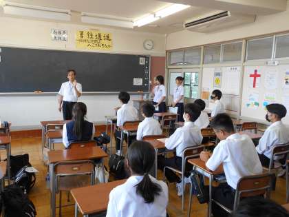 全員で気合いを入れた後、教頭先生から激励の言葉をいただきました。真剣に耳を傾けています。(写真左、中)
