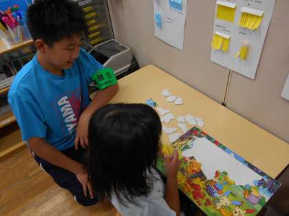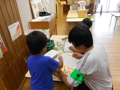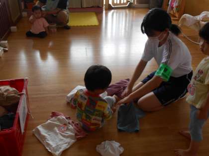 「社会に学ぶ『14歳の挑戦』」1日目【三郷保育所】 公開日 2024/07/09 更新日 2024/07/09 2年生 お昼寝から目覚めた園児たちの着替えや遊びの補助をしています。優しく見守ったり、進んで話をしたりして取り組んでいました。午前中は、水遊びの準備やお世話をしました。
