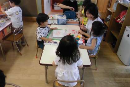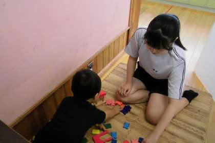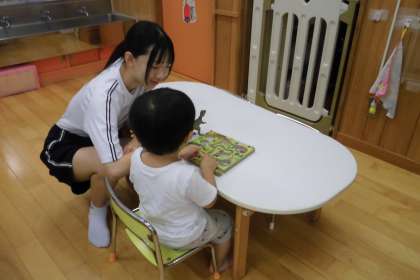「社会に学ぶ『14歳の挑戦』」2日目 【富山市立上条保育所】 公開日 2024/07/09 更新日 2024/07/09 2年生 園児達の遊びを支援しています。優しい眼差しで接している様子が伝わってきます。指導ボランティアの方から、「丁寧に一生懸命に取り組んでいます。」とお褒めの言葉をいただきました。