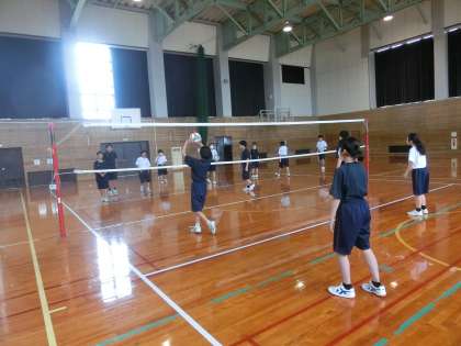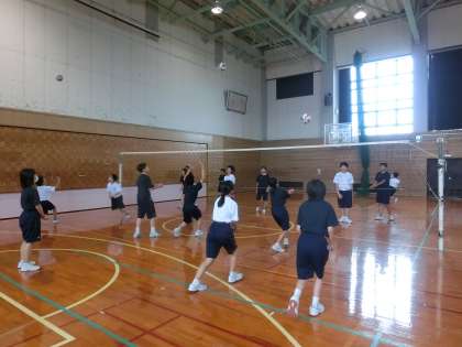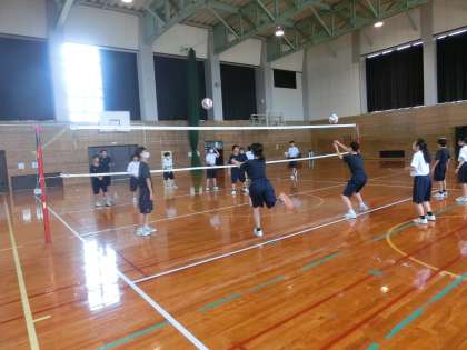 体育 バレーボールです。グループに分かれてパスやトスの練習をしています。