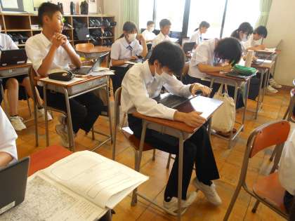 2A学習の様子 公開日 2024/07/16 更新日 2024/07/16 学校生活 総合 「14歳の挑戦」事後学習に入りました。5日間での成長やエピソードを、プリントやスライドにまとめ始めました。「こんなことが大変だった。」「こんなことができるようになった。」など盛り上がりました。