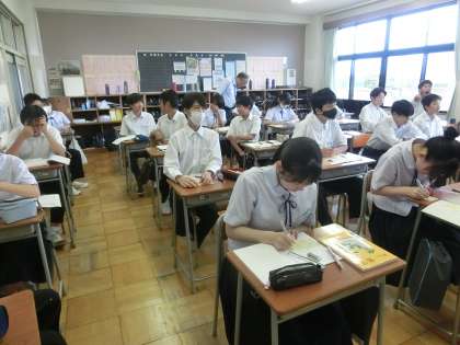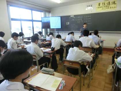 2A 学習の様子 公開日 2024/09/02 更新日 2024/09/02 学校生活 数学 一次関数のグラフの復習をしました。変化の割合について忘れている人が多かったようです。中2の数学は内容が盛りだくさんです。しっかり身につけておきましょう。
