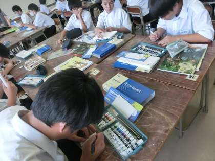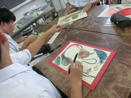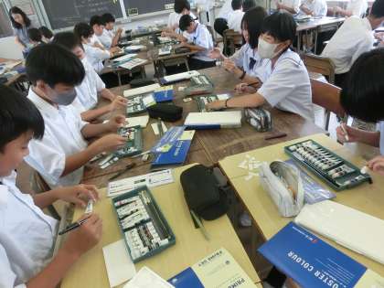 美術 作品の仕上げの作業を行ったあと、ポスターカラーが配られました。聞き慣れない色の名前に興味津々でした。