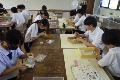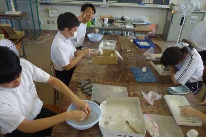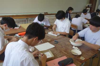 3A 授業の様子 公開日 2024/09/04 更新日 2024/09/04 3年生 美術の授業で、高麗石を材料に抽象彫刻をしています。 彫刻刀ややすり等を使い、思い思いに石を削って作品を製作していました。