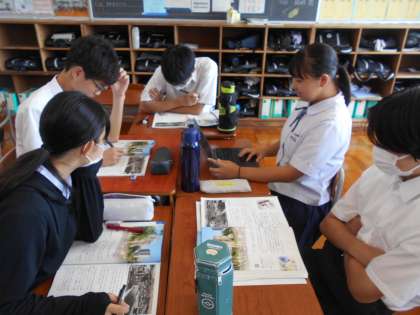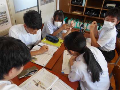 3A学習の様子 公開日 2024/09/09 更新日 2024/09/09 学校生活 英語 新しい単元に入りました。新出単語や文法を確認したあと、グループに分かれて、ページごとの内容をまとめました。次回はグループごとに発表を行います。