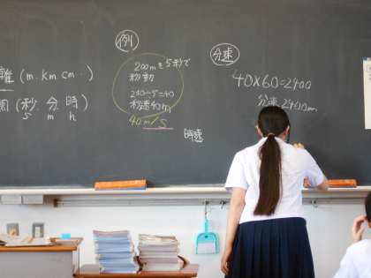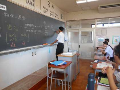 理科 物体が移動する速さを求めました。秒速、分速、時速の変換も、素早くできていました。