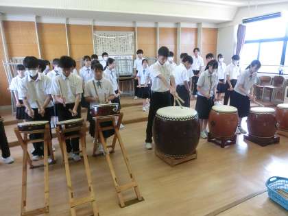 音楽 三成太鼓をしています。来週2年生に引き継ぐためにパートごとに話し合いをしました。
