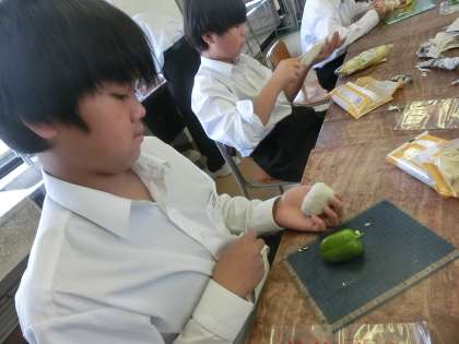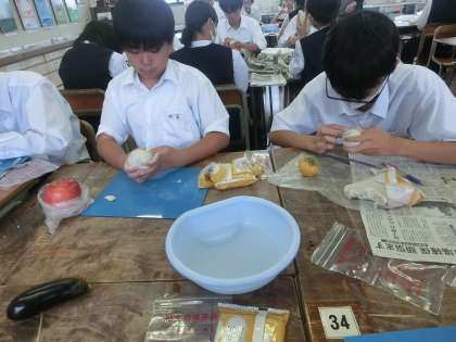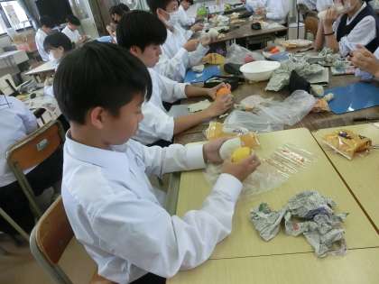 美術 「特徴をとらえてつくろう」という課題で果物や野菜を本物に見えるように作っています。