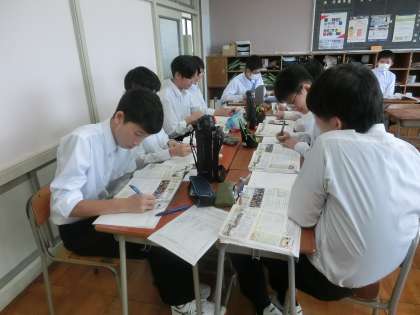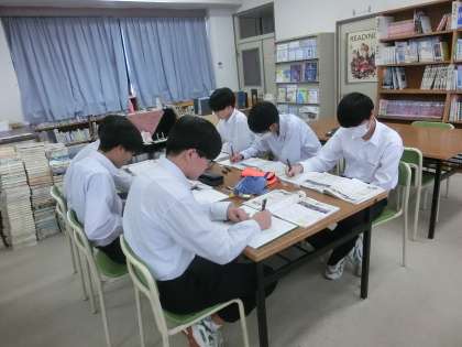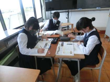 社会 グループやペア、個人などの自由な形で内閣の仕事や役割について調べ、ノートにまとめています。