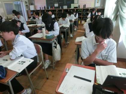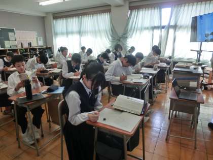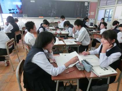 2A 学習の様子 公開日 2024/10/17 更新日 2024/10/17 学校生活 国語 「字のない葉書」の続きです。戦時中の話なので、当時の様子を一生懸命想像しながら登場人物の心情を読み取っています。