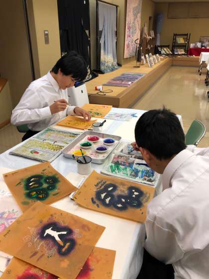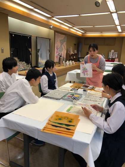 2年生 金沢校外学習 公開日 2024/10/25 更新日 2024/10/25 2年生 「加賀友禅会館」さんで、友禅染め体験をしました。「ぼかし」や「虫食い」の方法を駆使してオリジナルの巾着が仕上がりました。