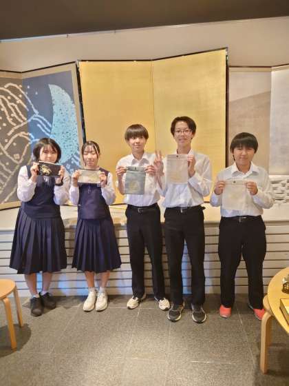 こちらの班も「今井金箔」さんで金箔貼り体験を行いました。仕上がったマイポーチを手にして記念撮影です。