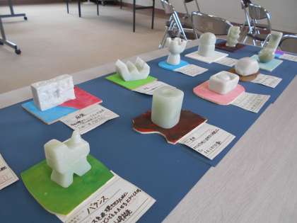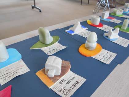 3学年では「石彫」を展示しています。工具を使ったり、耐水ペーパーを使って磨き上げたりして、熱心に仕上げていました。