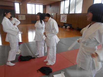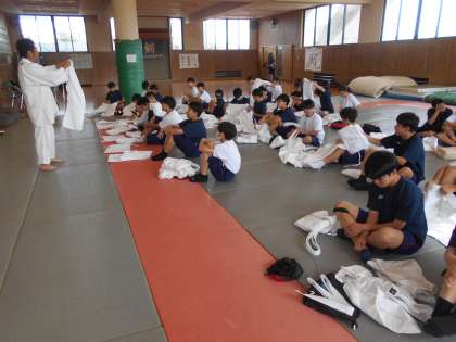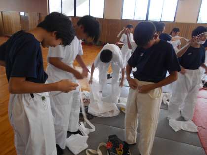 体育 武道場で初めての柔道の授業でした。柔道着を着る練習や作法を学びました。