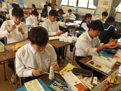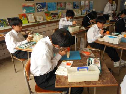1A学習の様子 公開日 2024/11/05 更新日 2024/11/05 学校生活 美術 粘土で作った野菜や身の回りのものに、色付けをしました。重ねて塗ったり、凹凸を表現してみたりしながら、本物に近づけていました。