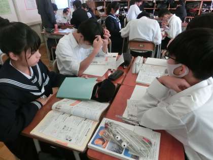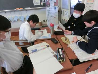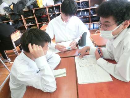 理科 前回の授業で行った実験結果について、グループで話し合っています。