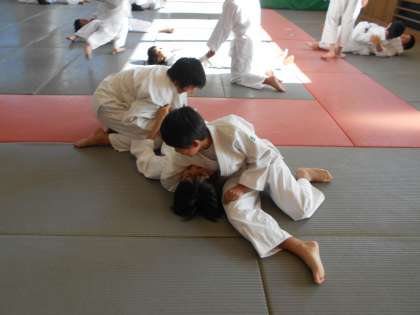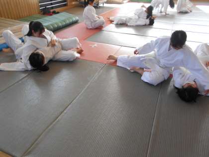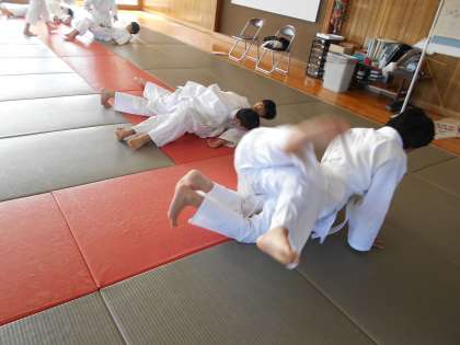 体育 柔道の授業です。ペアになって技の掛け合いの練習をしています。
