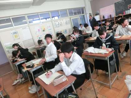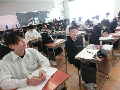 2A 学習の様子 公開日 2024/11/14 更新日 2024/11/14 学校生活 数学 証明の学習の続きです。今回は「三角形の2つの底角が等しいときは、その三角形は二等辺三角形といえるのか」について考えました。