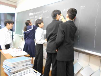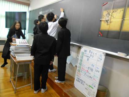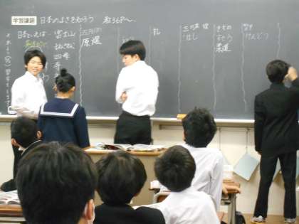 美術 「日本のよさを知ろう」という課題のもと、1人ずつ「日本らしいもの」を出し合ってイメージを共有しました。