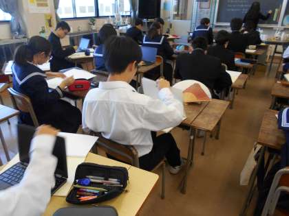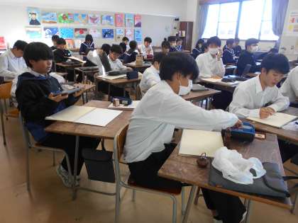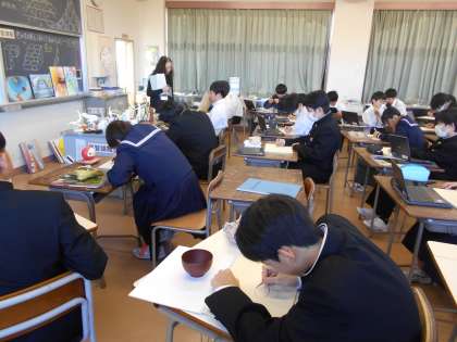 美術 和のものを自分で家から持ってきたり、端末で調べたりしながら、スケッチしました。こけし、だるま、茶碗、扇子などを描いていました。