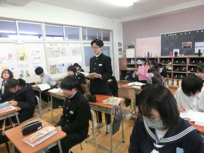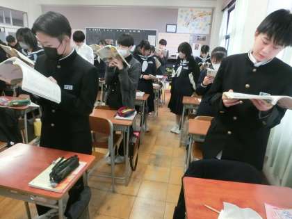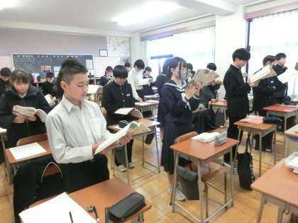 国語 『平家物語』の学習が始まりました。平曲のリズムを感じながら、冒頭部分を音読しています。